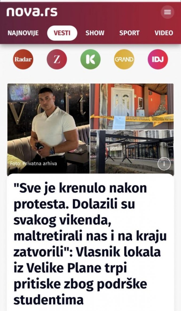 Наиме, у тексту на порталу Слободне далмације се наводи како је власник угоститељских објеката из Велике Плане Никола Арсић у више наврата за блокадерски портал Нова.рс причао да већ месецима трпи наводне “институционалне притиске” због јавне подршке блокадерским протестима против власти.