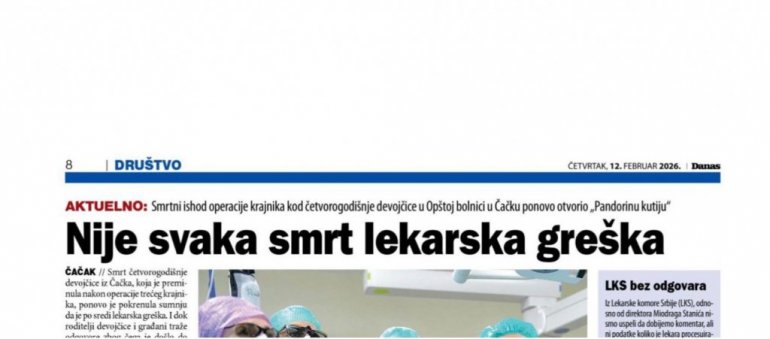 ЛИСТ "Данас" променио је наратив чим се утврдило да је лекар који је оперисао девојчицу у Чачку Е.М. (4) блокадер.