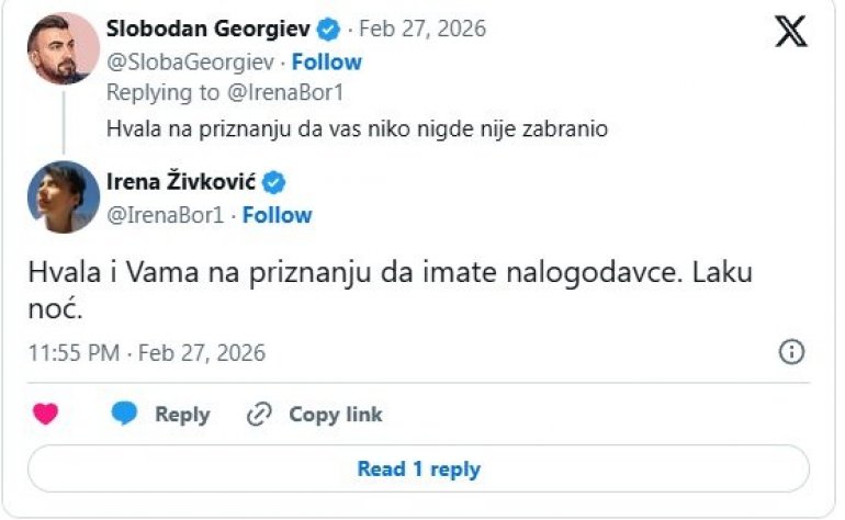 ОПОЗИЦИОНАРКА Ирена Живковић написала је на свом профилу на друштвеној мрежи Икс да ју је Слободан Геогиев блокирао на Н1 чим је изашла из Странке слободе и правде, преносе медији.