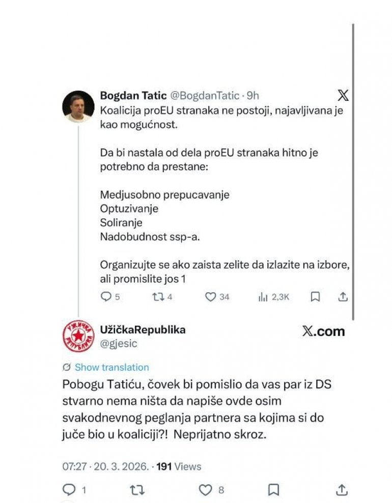 - Коалиција проЕУ странака не постоји, најављивана је као могућност. Да би настала од дела проЕУ странака хитно је потребно да престане: Међусобно препуцавање, оптуживање, солирање, надобудност ССП-а. Организујте се ако зауста желите да излазите на изборе, али промислите још једном - написао је Богдан Татић.