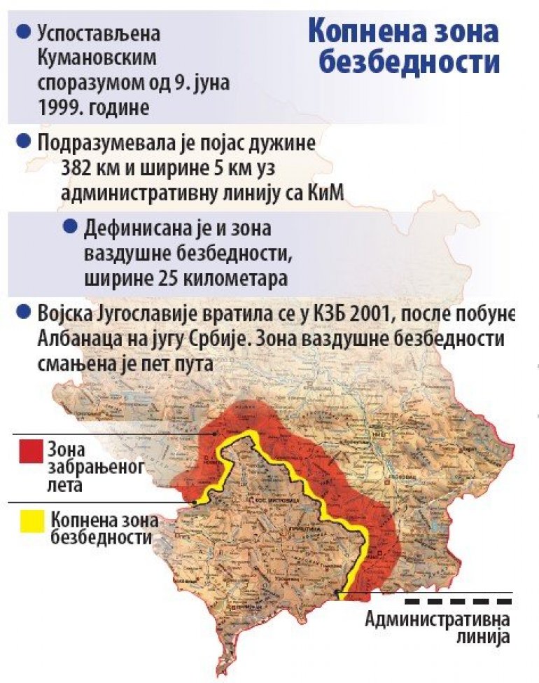 Копнена зона безбедности између централног дела Србије и АП КиМ, дуга 382 и широка пет километара, дефинисана је Војно-техничким споразумом који је потписан 9. јуна 1999. године у Куманову између међународних безбедносних снага, односно НАТО и представника СРЈ. То је била демилитаризована зона, под контролом УН, све док се тадашња југословенска војска није вратила на ту територију 2001. године. Сада КЗБ контролише Војска Србије, осим у једном делу на тромеђи Северне Македоније, КиМ и Централне Србије, где се у бази Козјак стално налазе припадници Жандармерије. Њихови примарни задаци су борба против тероризма и спречавање илегалних миграција.