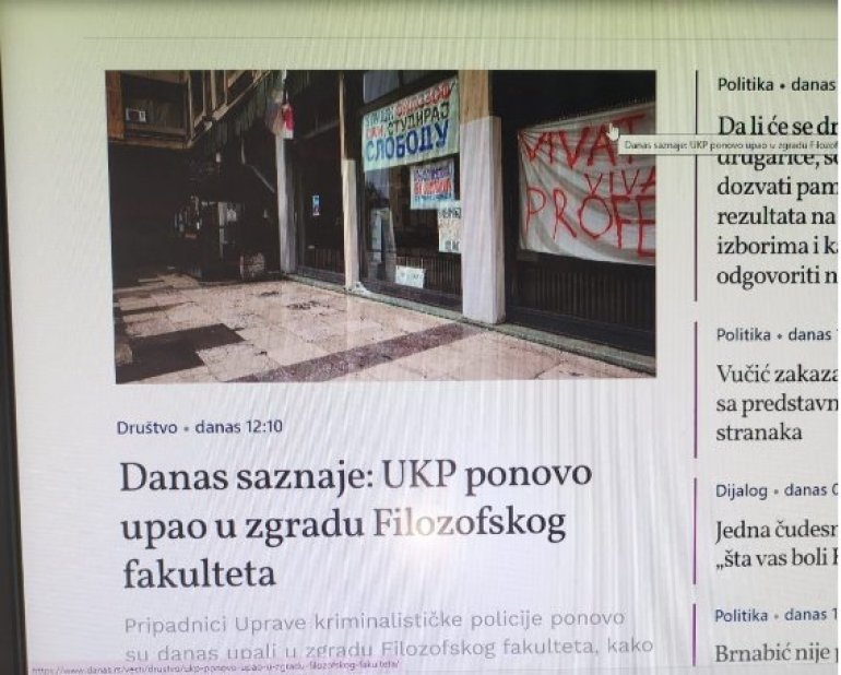 ТАЈКУНСКИ медиј "Данас" је у својом тексту навео како је Управа криминалистичке полиције (УКП) извела још један "упад" у зграду Филозофског факултета у Београду, иако је по договору и у складу са Законом дошла како би преузела Правилник о безбедности те институције.