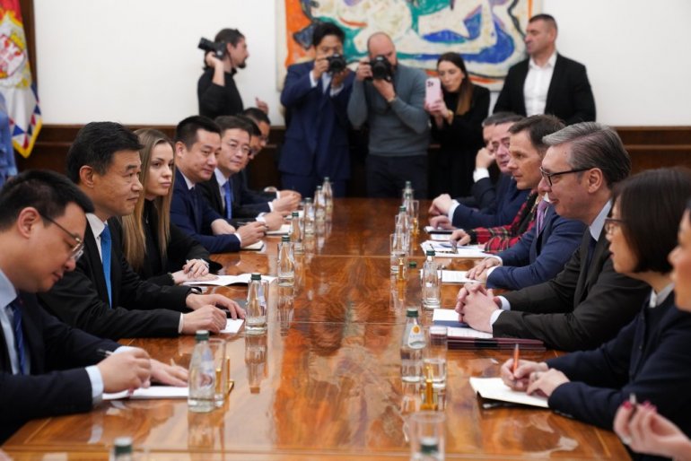ПРЕДСЕДНИК Републике Србије Александар Вучић састао се данас у згради Председништва с представницима делегације корпорације Шендонг хај спид груп (Shandong Hi-Speed Group).