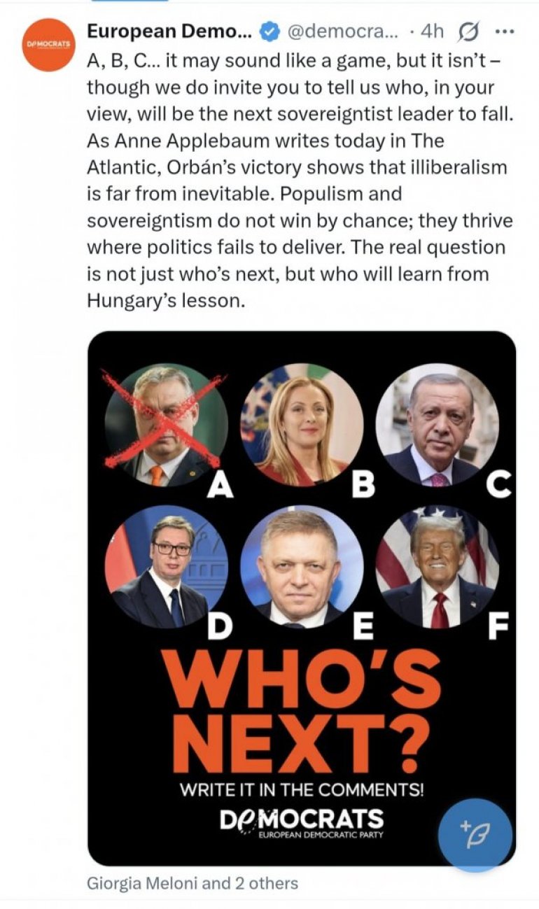 - А, Б, Ц... можда звучи као игра, али није – иако вас позивамо да нам кажете ко ће, по вашем мишљењу, бити следећи суверенистички лидер који ће пасти. Као што Ен Еплбаум пише данас у The Atlantic-у, Орбанова победа показује да илиберализам далеко од тога да је неизбежан. Популизам и суверенизам не побеђују случајно; они успевају тамо где политика не успева да испуни очекивања. Право питање није само ко је следећи, већ ко ће научити лекцију из Мађарске - наводи се у срамној објави европских демократа.