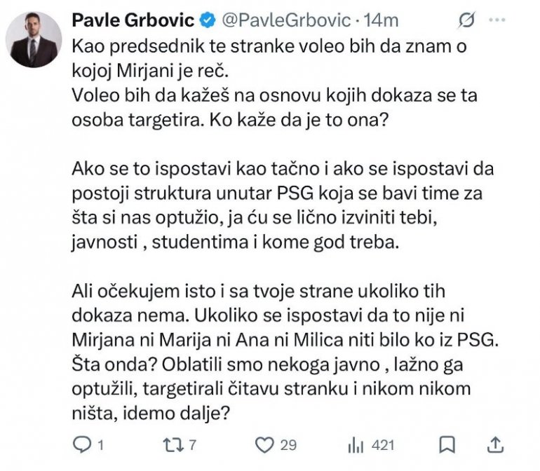 - Као председник те странке волео бих да знам о којој Мирјани је реч. Волео бих да кажеш на основу којих доказа се та особа таргетира. Ко каже да је то она? Ако се то испостави као тачно и ако се испостави да постоји структура унутар ПСГ која се бави тиме за шта си нас оптужио, ја ћу се лично извинити теби, јавности , студентима и коме год треба. Али очекујем исто и са твоје стране уколико тих доказа нема. Уколико се испостави да то није ни Мирјана ни Марија ни Ана ни Милица нити било ко из ПСГ. Шта онда? Облатили смо некога јавно , лажно га оптужили, таргетирали читаву странку и ником ником ништа, идемо даље? - написао је Павле Грбовић.
