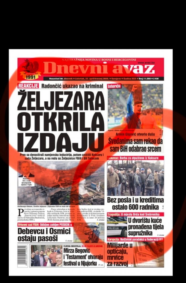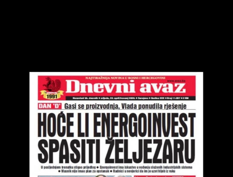 У данашњем издању "Дневног аваза", најтиражнијег дневног листа у БиХ, осванули су наслови: Жељезара открила издају, о девастацији наменске индустрије, уништења Коксаре и сада Жељезаре, а на реду су Железнице ФБиХ и БХ Телеком.