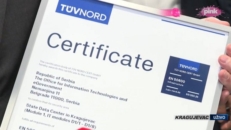Подсећамо, Државном дата центру у Крагујевцу компанија ТÜВИТ свечано је 2023. године, у Београду, уручила сертификат, према стандарду ЕН 50600 за испуњавање највишег нивоа поузданости, сигурности и ефикасности чувања опреме и података – сертификат за класу 4.