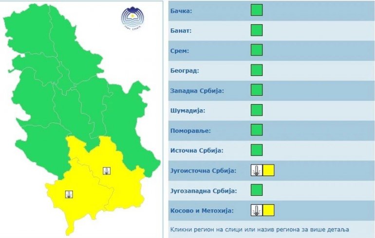 RHMZ je izdao i upozorenje na niske temperature i prizemni mraz u jugoistočnoj Srbiji i na Kosovu i Metohiji, a zbog toga je na snazi žuti meteoalarm.