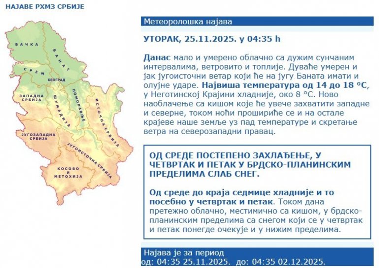 Duvaće umeren i jak jugoistočni vetar koji će na jugu Banata imati i olujne udare, dok će temperature biti od nula do devet stepeni na severu zemlje, a najviša dnevna od 14 do 18 stepeni, u Negotinskoj Krajini oko 8 stepeni.