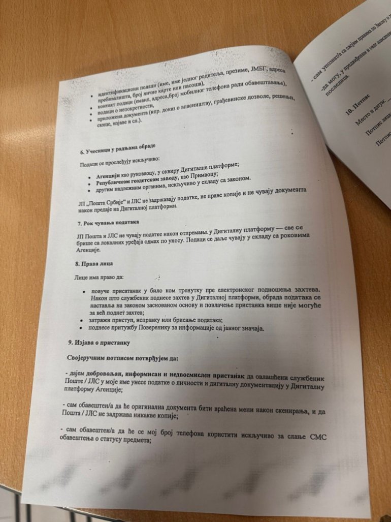 Reč je o obrascu koji služi za davanje pristanka zaposlenom u JP "Pošta Srbije" i JLS da, u ime podnosioca zahteva, unese njegove podatke o ličnosti u Digitalnu platformu za sprovođenje postupka evidentiranja nepokretnosti.