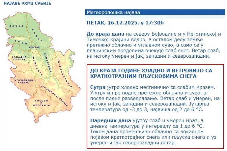 - Do kraja dana na severu Vojvodine i u Negotinskoj i Timočkoj krajini vedro. U ostalom delu zemlje pretežno oblačno i uglavnom suvo, a samo se u planinskim predelima očekuje slab sneg. Vetar slab, na istoku umeren i jak, zapadni i severozapadni.