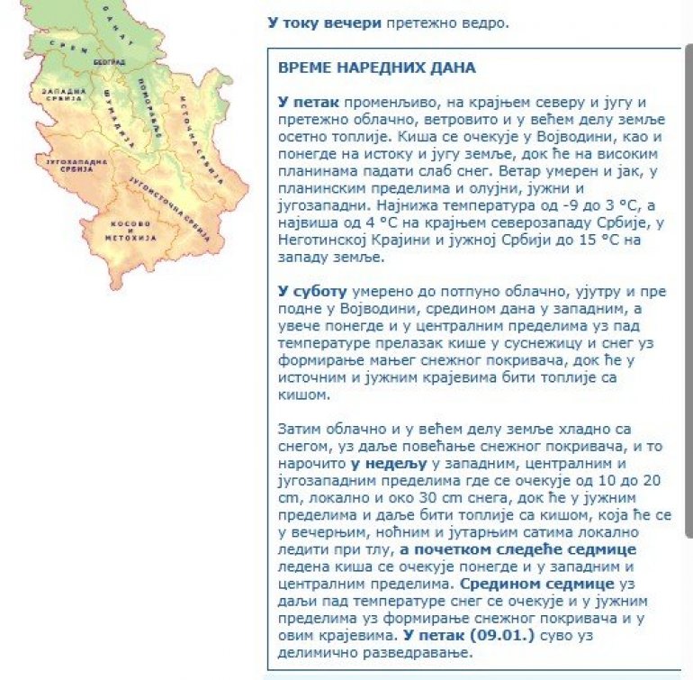 Zatim oblačno i u većem delu zemlje hladno sa snegom, uz dalje povećanje snežnog pokrivača, i to naročito u nedelju u zapadnim, centralnim i jugozapadnim predelima gde se očekuje od 10 do 20 cm, lokalno i oko 30 cm snega, dok će u južnim predelima i dalje biti toplije sa kišom, koja će se u večernjim, noćnim i jutarnjim satima lokalno lediti pri tlu, a početkom sledeće sedmice ledena kiša se očekuje ponegde i u zapadnim i centralnim predelima. Sredinom sedmice uz dalji pad temperature sneg se očekuje i u južnim predelima uz formiranje snežnog pokrivača i u ovim krajevima. U petak (09.01.) suvo uz delimično razvedravanje. - stoji na sajtu RHMZ.