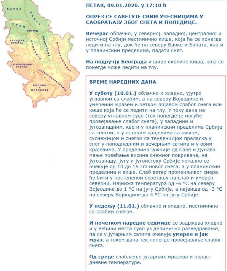 U subotu (10.01.) oblačno i hladno, ujutro uglavnom sa slabim, a na severu Vojvodine i umerenim mrazem i retkom pojavom slabog snega ili kiše koja će se lediti na tlu. U toku dana na severu uglavnom suvo (tek ponegde je moguće provejavanje slabog snega), u zapadnim i jugozapadnim, kao i u planinskim predelima Srbije sa snegom, a u ostalim krajevima sa kišom, susnežicom i snegom sa tendencijom prelaska u sneg u popodnevnim i večernjim satima i u ovim krajevima. U predelima južnije od Save i Dunava manje povećanje visine snežnog pokrivača, na jugozapadu, jugu i jugoistoku Srbije lokalno se očekuje od 10 do 15 cm novog snega, a u planinskim predelima i više. Slab vetar promenljivog smera će biti u postepenom skretanju na slab i umeren severni. Najniža temperatura od -6 °S na severu Vojvodine do 1 °S na jugu Srbije, a najviša od -3 °S na severu Vojvodine do 4 °S na jugu Srbije.
