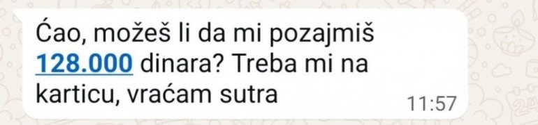 Poruka uglavnom glasi: "Ćao, možeš li da mi pozajmiš 120.000 dinara? Treba mi na karticu, vraćam sutra".