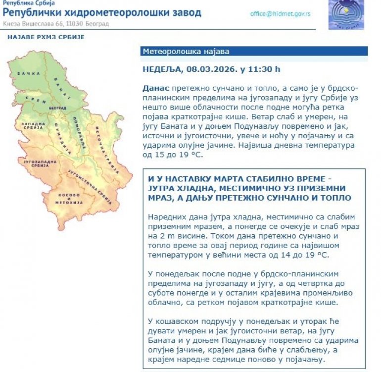 DANAS pretežno sunčano i toplo, a samo je u brdsko-planinskim predelima na jugozapadu i jugu Srbije uz nešto više oblačnosti posle podne moguća retka pojava kratkotrajne kiše.