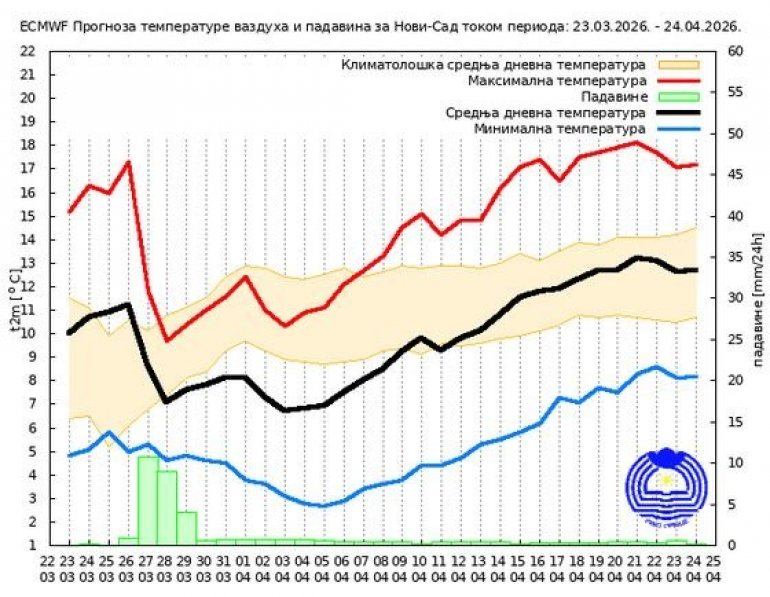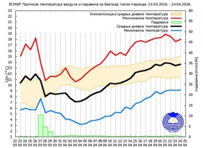 Prema sezonskoj prognozi RHMZ-a, srednja minimalna temperatura vazduha u aprilu biće iznad višegodišnjeg proseka, pri čemu će njena vrednost biti viša za 0.5ºS do 1.0ºS u odnosu na višegodišnji prosek. U Beogradu i široj okolini predviđa se vrednost aprilske srednje minimalne temperature vazduha oko 10.0ºS. Srednja maksimalna temperatura vazduha u aprilu biće iznad višegodišnjeg proseka, sa vrednostima, koje će u celoj Srbiji biti za 0.5ºS do 1.0ºS više u odnosu na višegodišnji prosek. U Beogradu i široj okolini srednja maksimalna temperatura vazduha tokom aprila biće oko 18.9ºS. Mesečna suma padavina tokom aprila zadržavaće se u granicama višegodišnjeg proseka sa vrednostima za 5 mm do 10 mm višim u odnosu na višegodišnji prosek. U Beogradu i široj okolini aprilska suma padavina iznosiće oko 58 mm.