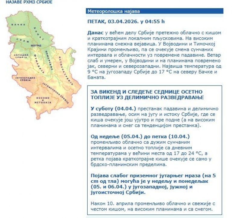Pojava slabog prizemnog jutarnjeg mraza (na 5 cm od tla) moguća je u nedelju i ponedeljak (05. i 06.04.) u jugozapadnoj, južnoj i jugoistočnoj Srbiji.
