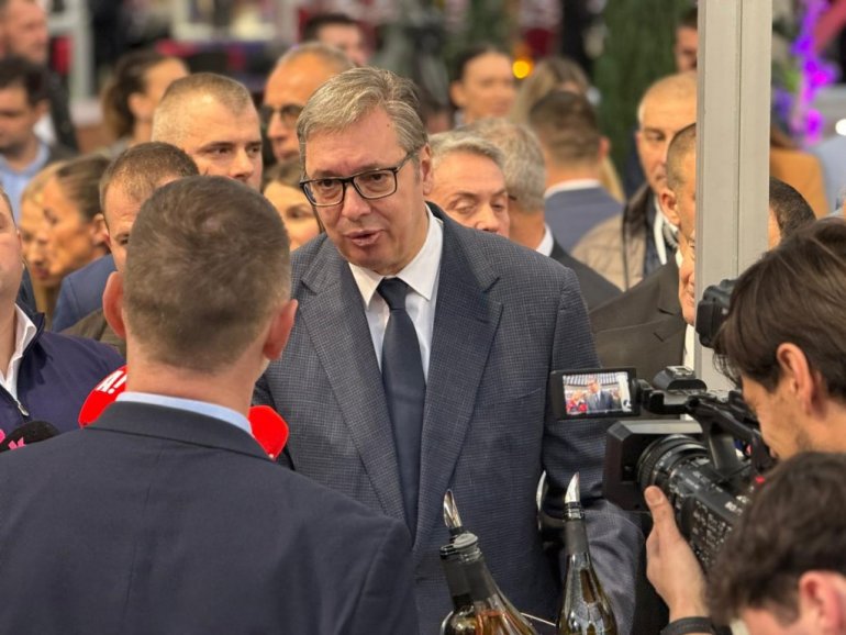PREDSEDNIK Srbije Aleksandar Vučić, obilazeći štandove na sajmu vina "Vinska vizija Otvorenog Balkana", rekao je da je noćas i jutros razgovarao oko NIS-a i da danas ide opet.