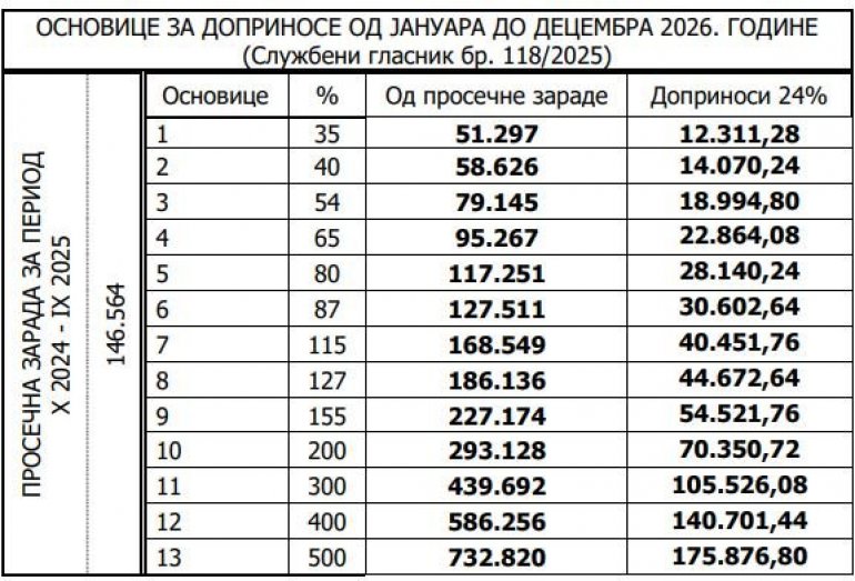 OD uplate za januar 2026. godine važe nove osnovice osiguranja, koje su za 11,6% više u odnosu na prethodnu godinu i građani mogu da se opredele za jednu od 13 osnovica osiguranja, nezavisno od stručne spreme koju imaju, saopšteno je iz PIO fonda.