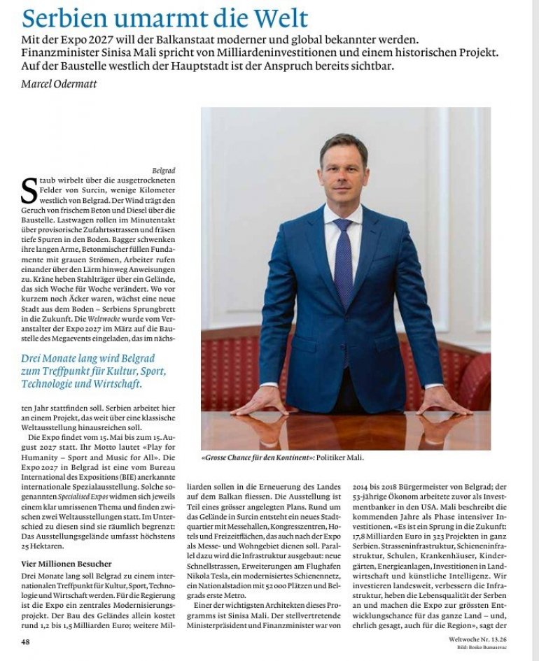 PRESTIŽNI švajcarski list Veltvohe objavio je impresivan članak o nadolazećem Ekspu 2027. Kako navode Srbija će od 15. maja do 15. avgusta 2027. biti centar dešaavnja i međunarodno mesto susreta kulture, sporta, tehnologije i ekonomije.