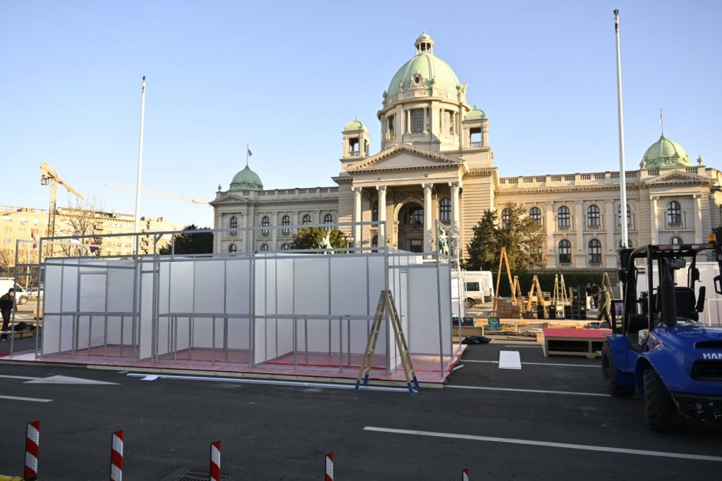 BOŽIĆNO SELO ISPRED NARODNE SKUPŠTINE: Počelo postavljanje objekata - stigle i jelke (FOTO)