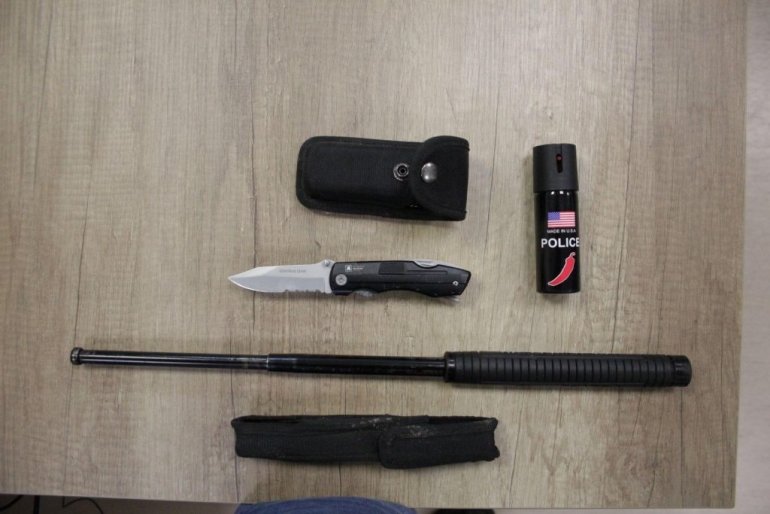 Pregledom vozila u levim prednjim vratima u pregradi je pronađena jedna teleskopska palica, kombinovani nož i biber sprej. Svi predmeti su oduzeti.