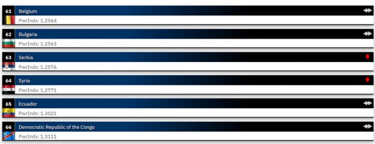 Prema ovom rangiranju, Hrvatska se nalazi na 74. mestu, dok je Srbija rangirana na 63, a Bosna i Hercegovina na 132. mestu. Uz tri vodeće sile, u samom vrhu liste nalaze se još Indija, Južna Koreja, Ujedinjeno Kraljevstvo, Japan, Francuska, Turska i Italija. Zanimljivo je da neke od tih zemalja imaju znatno manji broj aktivnih vojnika od država koje su rangirane niže, što dodatno potvrđuje da sama brojnost nije presudan kriterijum vojne snage. Japan, na primer, duguje visoku poziciju snažnoj mornarici i vazdušnim snagama, uključujući jednu od najmodernijih flota razarača, savremene borbene avione i napredne protivraketne sisteme.