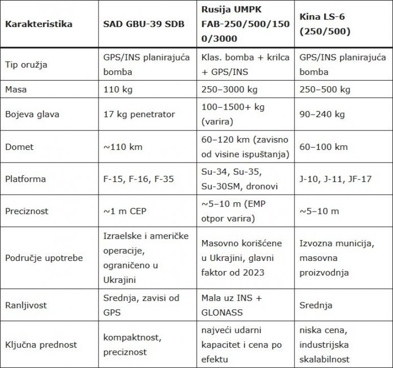 U nastavku je upoređena tehnologija: američka GBU-39, ruske UMPK/KAB bombe i kineska LS-6, sa tehničkim karakteristikama i realnom borbenom vrednošću.
