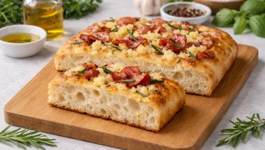Visoka, vazdušasta i neodoljivo mirisna, ova fokača je dokaz da jednostavni sastojci, kada se spoje sa pravom tehnikom, daju spektakularan rezultat. Testo sa visokom hidratacijom, obogaćeno maslinovim uljem, nosi rustičan sloj kuvanog krompira, hrskavu slaninu i iglice svežeg ruzmarina.
