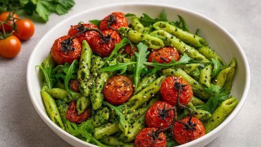 Kombinacija svežeg avokada i bebi spanaća daje neverovatno kremast sos bez trunke mleka, dok pečeni čeri paradajz, rukola i crni susam dodaju savršenu svežinu i teksturu. Zdravo, lako, mirisno i jarko zeleno.