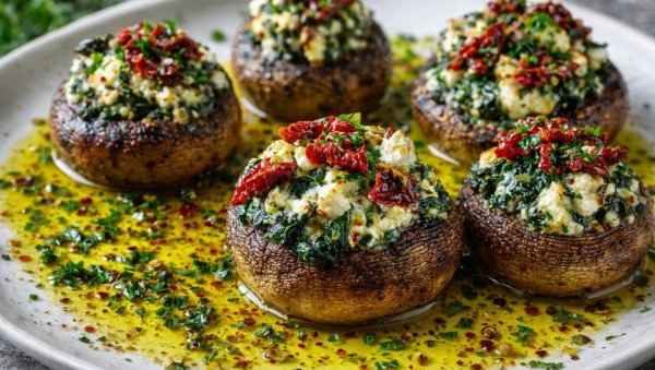 Ove punjene pečurke su prave bombe punog mediteranskog ukusa. Kremast, slani fil sa fetom, svežim spanaćem i sušenim paradajzom savršeno se uklapa u mekane, pečene šešire pečuraka. Idealne su kao predjelo, meze ili lagani vegetarijanski obrok.
