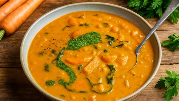Ova bogata supa sa puno povrća idealan je izbor za topaoi zdrav obrok. Kombinacija bundeve, patlidžana, sočiva i kremaste pavlake uz završni dodir zelenog pesta čini je pravom malom prazničnom činijom.