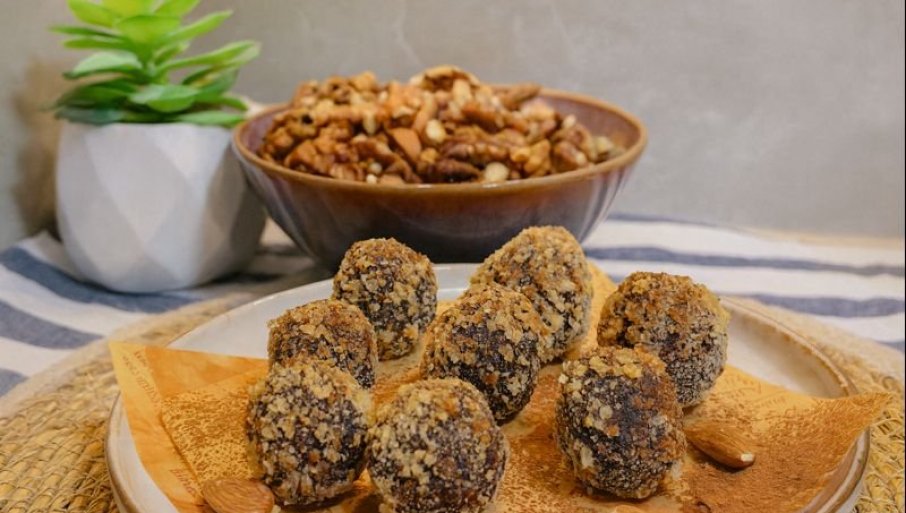 Po želji prepecite bademe i orahe. Iz urmi izvadite koštice. U blender stavite bademe i orahe i usitnite ih tako da ostane malo krupnijih komadića. Dodajte urme i kakao pa sve zajedno izblendajte dok ne dobijete ujednačenu smesu. Proverite da li smesa može da se oblikuje u kuglicu. Ako se raspada, dodajte malo vode (kašičicu po kašičicu) i ponovo izblendajte. Od smese oblikujte kuglice, uvaljajte ih u mlevene orahe i pospite kakao prahom.