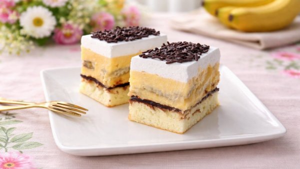 Savršeno mekan biskvit, sloj čokoladnog namaza, nežna vanil krema i sveže banane – kombinacija koja uvek uspeva. Ovaj kolač je idealan za porodična okupljanja, rođendane ili kada želite proverenu, kremastu poslasticu koja se lako priprema.