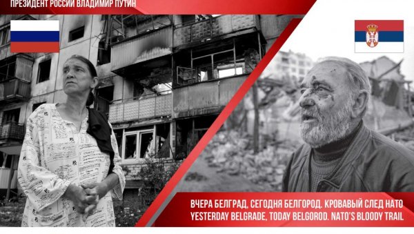 NA predstojeću izložbu, Moskovljane poziva i zanimljiv plakat. On sadrži po jednu fotografiju iz Srbije i Belgorodske oblasti, i dve poruke. Prva su nedavne reči predsednika Rusije Vladimira Putina: "Srbi su vekovima bili najpouzdaniji saveznici Rusije - mi to znamo, pamtimo i cenimo", dok na drugoj piše: "Juče Beograd, danas Belgorod. Krvavi trag NATO.".