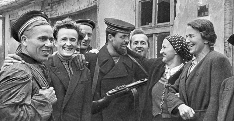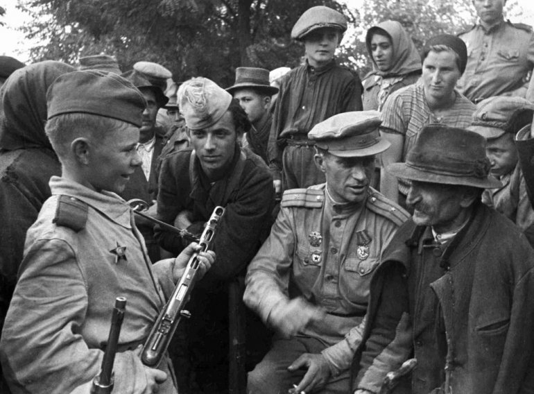 Komandant bataljona strelaca Romanenko i mali izviđač Vita Žajvoronko sa žiteljima Starčeva i partizanima