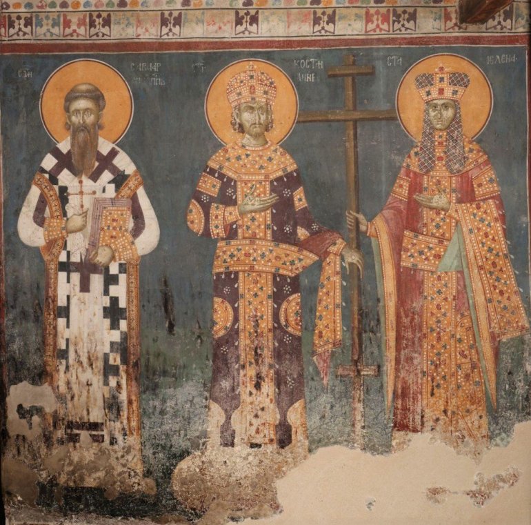 Ravnoapostolni svetitelji Sava, Konstantin i Jelena na fresci u Gračanici