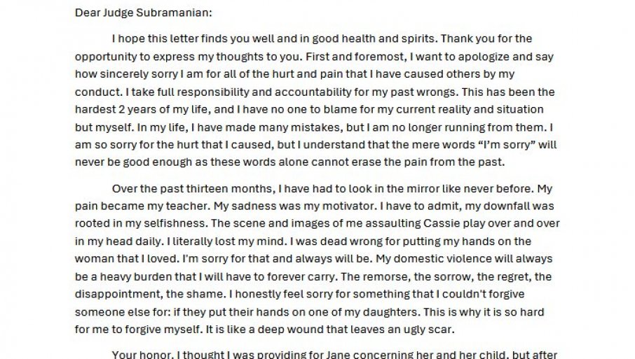 U emotivnom obraćanju, Kombs je rekao da su poslednje dve godine njegovog života bile najteže i da nema koga drugog da okrivi osim sebe. Posebno je istakao scene nasilja nad bivšom partnerkom Kasandrom „Kesi“ Venturom kao nešto što ga proganja svaki dan.