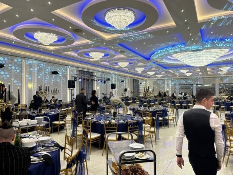 U sali dominiraju plavo-zlati tonovi, na plafonu su svuda bili kristalni lusteri, a na svakom tanjiru nalazila se posebna poruka i mali poklon.