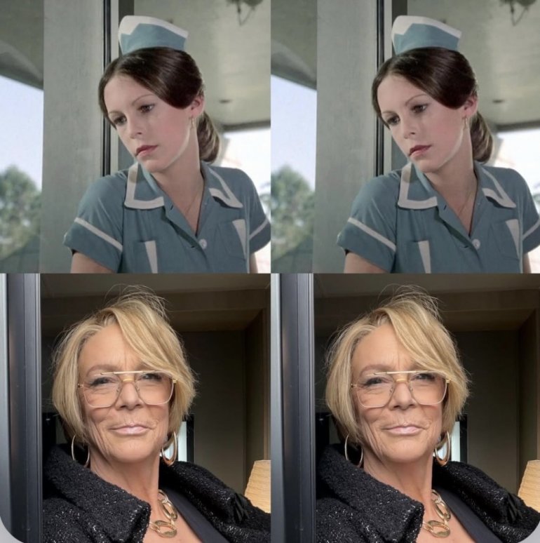 Sa pratiocima je podelila fotografiju iz 1977. godine, kada je kao devetnaestogodišnjakinja igrala bezimenu konobaricu u seriji „Kolumbo“. Na slici je mlada, sa tamnom kosom vezanom u rep i kapicom, u jednostavnoj plavoj uniformi. Uz nju je objavila i noviji „selfi“, sa prepoznatljivom kratkom plavom kosom, naočarima, upadljivim zlatnim nakitom i elegantnom crnom jaknom.