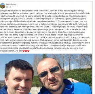 Vodio si Zrinjski, a ja Velež, nezamislivo je bilo da se slikamo zajedno, sedimo zajedno, i toliko sam te poštovao. Mislim da se tako nešto više nikada neće ponoviti. U vreme korone pozvao sam te u Mostar na iftar, došao si i ispoštovao me, a da je tada neko video dva trenera tako ljutih rivala kako sede zajedno u istoj sobi, niko nam ne bi verovao. Ali to smo bili MI... I sudbina je htela da Slavku pričam o tebi kad me pitao o trenerima u BiH, i eto, na moju preporuku, jer mi veruje, odlučio se za tebe.