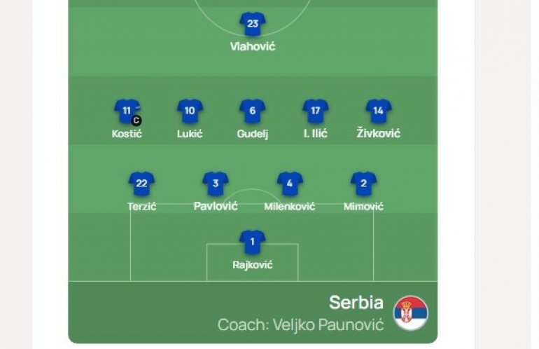 19.40 - Formacijski, dok meč ne počne, deluje da je Srbija u sistemu 4-5-1. Novi selektor Paunović je i najavio da će koristiti svoj omiljeni, "četvorodelni" princip zadnje linije, a čine ga, ispred golmana Rajkovića, desno Mimović, levo Terzić, a u sredini naši najbolji štoperi, Pavlović i Milenković. Petorka isprd njih su, s leva na desno, Kostić, Lukić, Gudelj, I. Ilić i Živković (jedan od ključnih igrača Paunovićevih "orlića" koji su 2015. postali prvaci sveta) dok je isturen Vlahović.