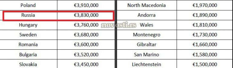 Naime, evropska kuća fudbala je upravo uplatila Ruskom fudbalskom savezu (RFS) 3.835.000 evra.