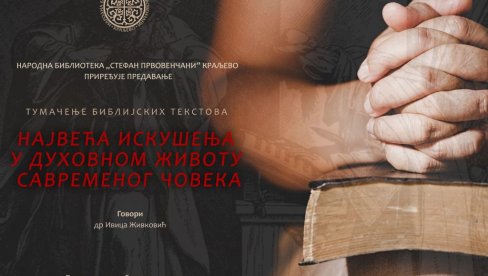 U OKVIRU programskog serijala „Tumačenje biblijskih tekstova”, u Narodnoj biblioteci „Stefan Prvovenčani“ večeras će, sa početkom u 19 sati, biti priređeno predavanje dr Ivice Živkovića na temu „Najveća iskušenja u duhovnom životu savremenog čoveka”.
