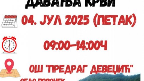 Akcija je planirana za petak 4. jul od 09:00 do 14:00 časova u OŠ „Predrag Devedžić“ u selu Prvonek.