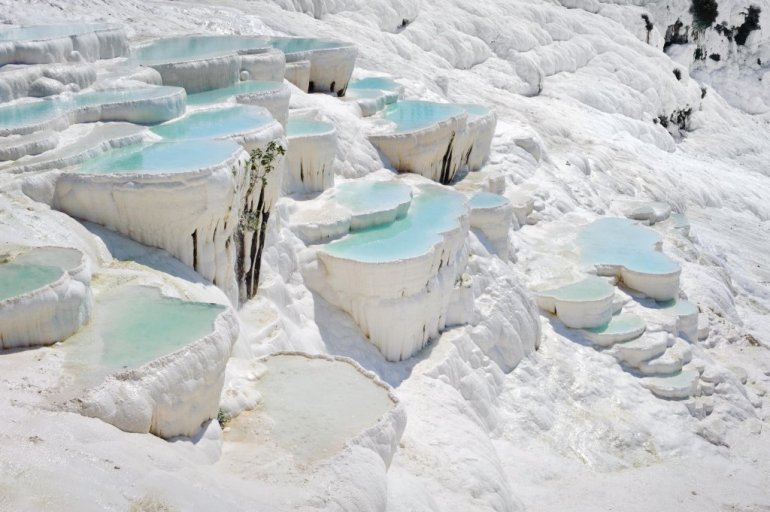 Jedna od najneobičnijih prirodnih atrakcija nalazi se u turskom Pamukaleu, gde su tokom hiljada godina nastale bele krečnjačke terase. U samim prirodnim bazenima kupanje nije dozvoljeno zbog zaštite, ali su u blizini uređeni bazeni sa toplom vodom za posetioce.