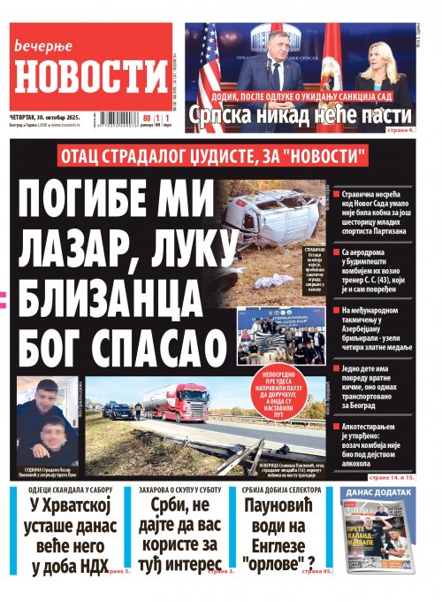 Večernje novosti - Naslovna strana - Štampano izdanje za 30.10.2025.
