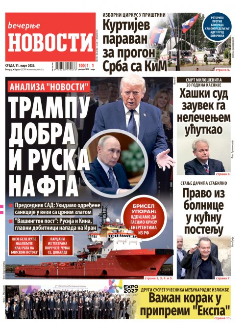 Večernje novosti - Naslovna strana - Štampano izdanje za 11.03.2026.