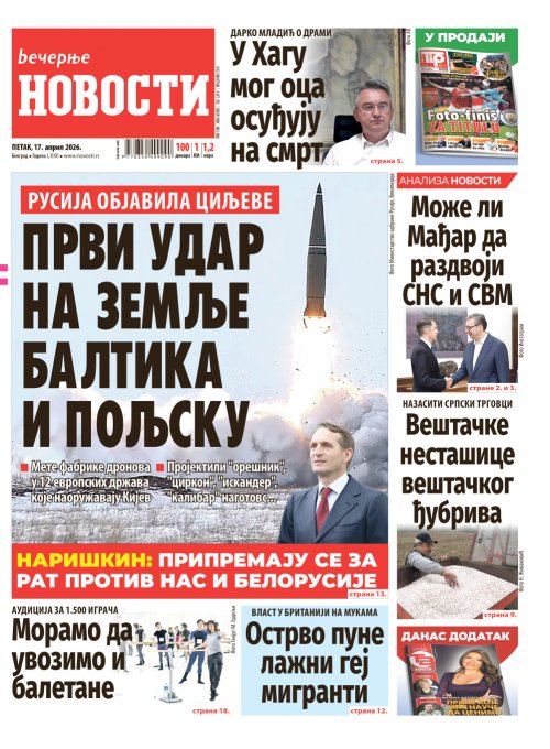Večernje novosti - Naslovna strana - Štampano izdanje za 17.04.2026.