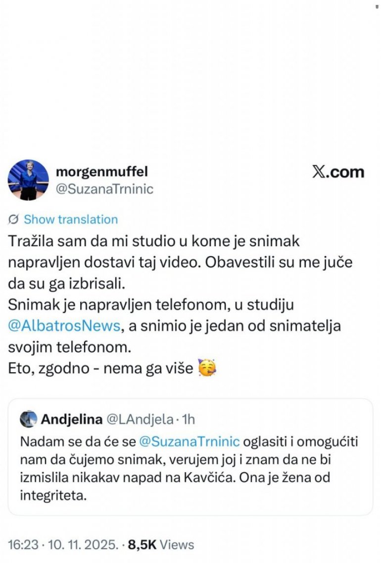 - Tražila sam da mi studio u kome je snimak napravljen dostavi taj video. Obavestili su me da su ga izbrisali. Snimak je napravljen telefonom, u studiju Albatros Njuz, a snimio ga je jedan od snimatelja svojim telefonom. Eto, zgodno, nema ga više - napisala je Trninić.